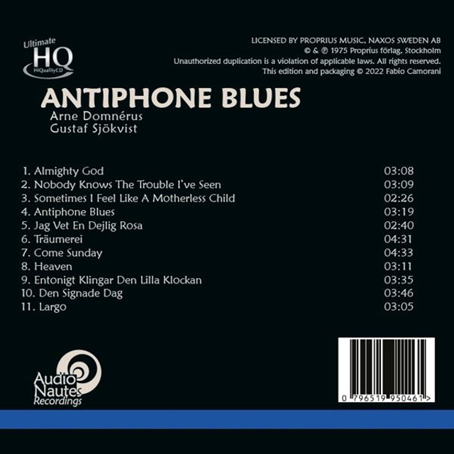 This UHQCD release of the 2022 album Antiphone Blues showcases late Swedish jazz saxophonist Arne Domnérus in duets with organist Gustav Sjökvist, recorded in Spanga Church in Sweden. Domnérus was involved in the 1977 audiophile classic Jazz at the Pawnshop and this album has earned a similar reputation over the years for its high-quality audio.