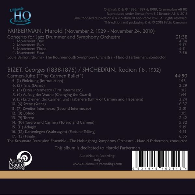 The "Farberman, Shchedrin - Concerto for Jazz & Carmen Suite" refers to a famous classical recording featuring Harold Farberman's Concerto for Jazz Drummer and Rodion Shchedrin's Carmen Suite (a ballet arrangement of Bizet's opera). This iconic album, often performed by the Kroumata Percussion Ensemble with drummer Louie Bellson, merges contemporary classical percussion with jazz and ballet, showcasing dramatic rhythm and innovative orchestration. Louis Bellson and the Kroumata Percussion Ensemble perform composer and conductor Harold Farberman's Concerto for Jazz Drummer & Orchestra, as well as Schedrin: Bizet's Carmen Suite. Louis Belson (Artist), Harold Farberman (Composer, Conductor), Bizet (Composer), Rodion Shchedrin (Composer), Bournemouth Symphony Orchestra (Orchestra), Helsingborg Symphony Orchestra (Orchestra), Kroumata Percussion Ensemble (Orchestra).